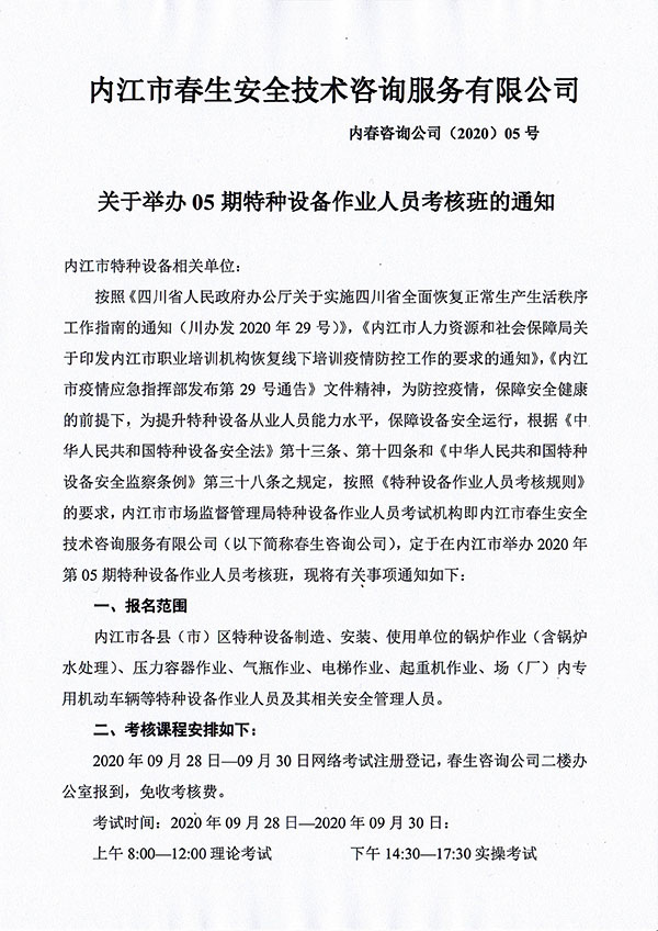 2020年春生公司05期特種設(shè)備作業(yè)人員考核班通知