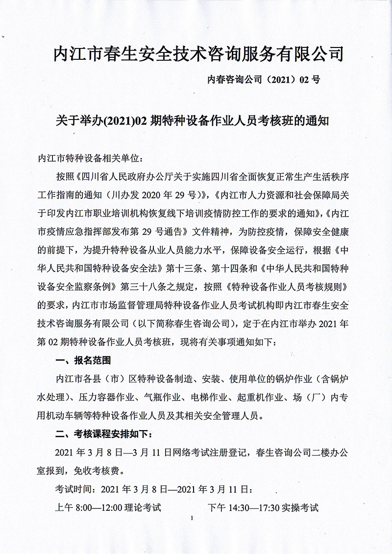 2021年春生公司02期特種設備作業(yè)人員考核班通知